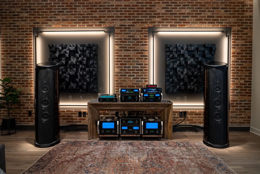 The Ovation retail space, owned by Bob Poynter in the suburbs of Indianapolis, utilizes a clear line of sight from front to back with an enclosed A/B switching room on one side, an ultra-high performance listening room on the other side, and an enclosed Atmos BTS theater room in the back.