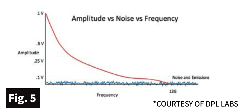 Do you see where I am going? With this low level of usable video signals, it’s a short walk to hit the 100mv over longer lengths with high-frequency content. A signal that leaves a source product can be as high as 1 volt (Fig. 5), offering major differences between the noise floor and the signal. But as it gets higher in frequency, this voltage level deteriorates due to insertion loss. It eventually will drop below the 100mv limit and mixes with the noise component. All it takes is some crosstalk or internal emissions to spoil the signal for any channel.