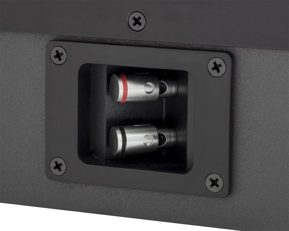 Paradigm binding posts – The E5-LCR employs a pair of spring-loaded binding posts in a recessed cavity. Space within the cavity is a little bit tight for speaker connections.