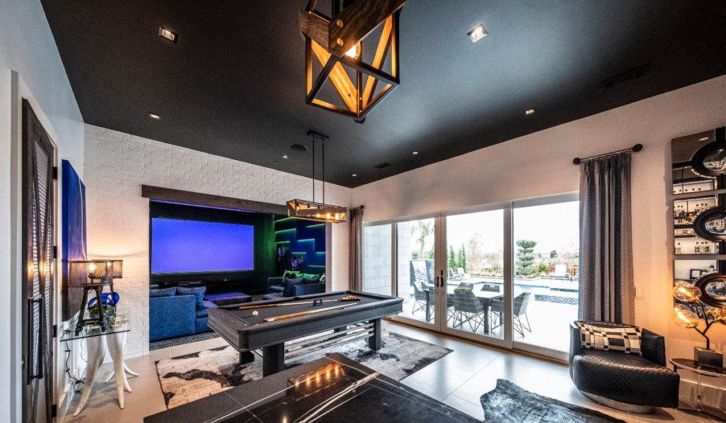 A large pool and connected hot tub add a luxurious outdoor space for families to relax while also experiencing some of the best in outdoor AV.