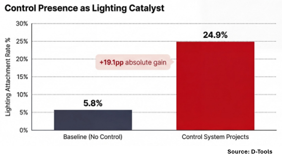 According to D-Tools, that represents a 19.1 percentage-point gap, underscoring how control platforms unlock higher-value lighting opportunities