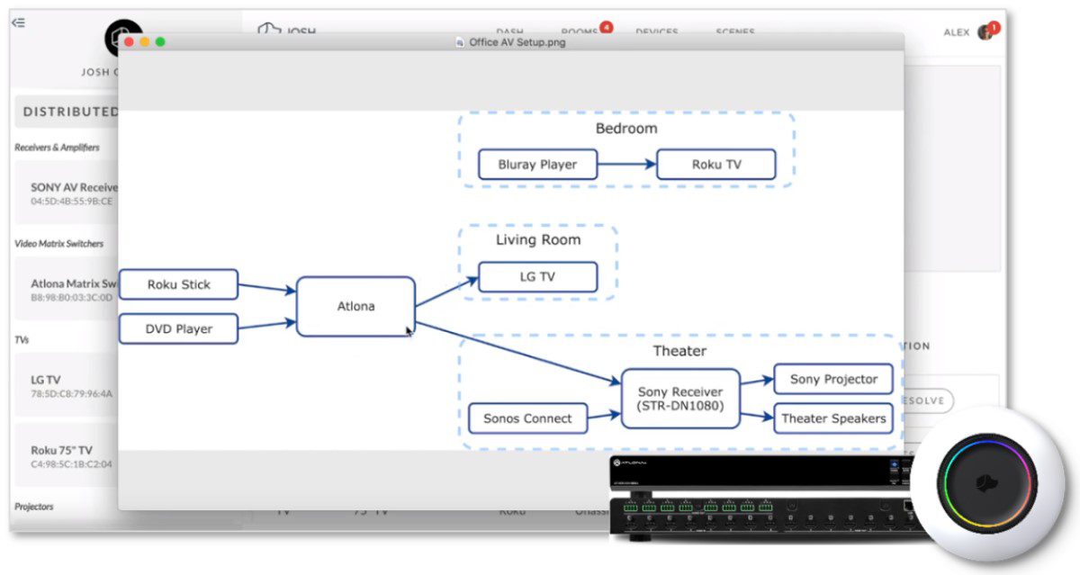 Josh does the work on the back end, thanks to new integrations with Atlona video matrix switchers (announced last November), and existing drivers for Roku and select TVs, projectors receivers.