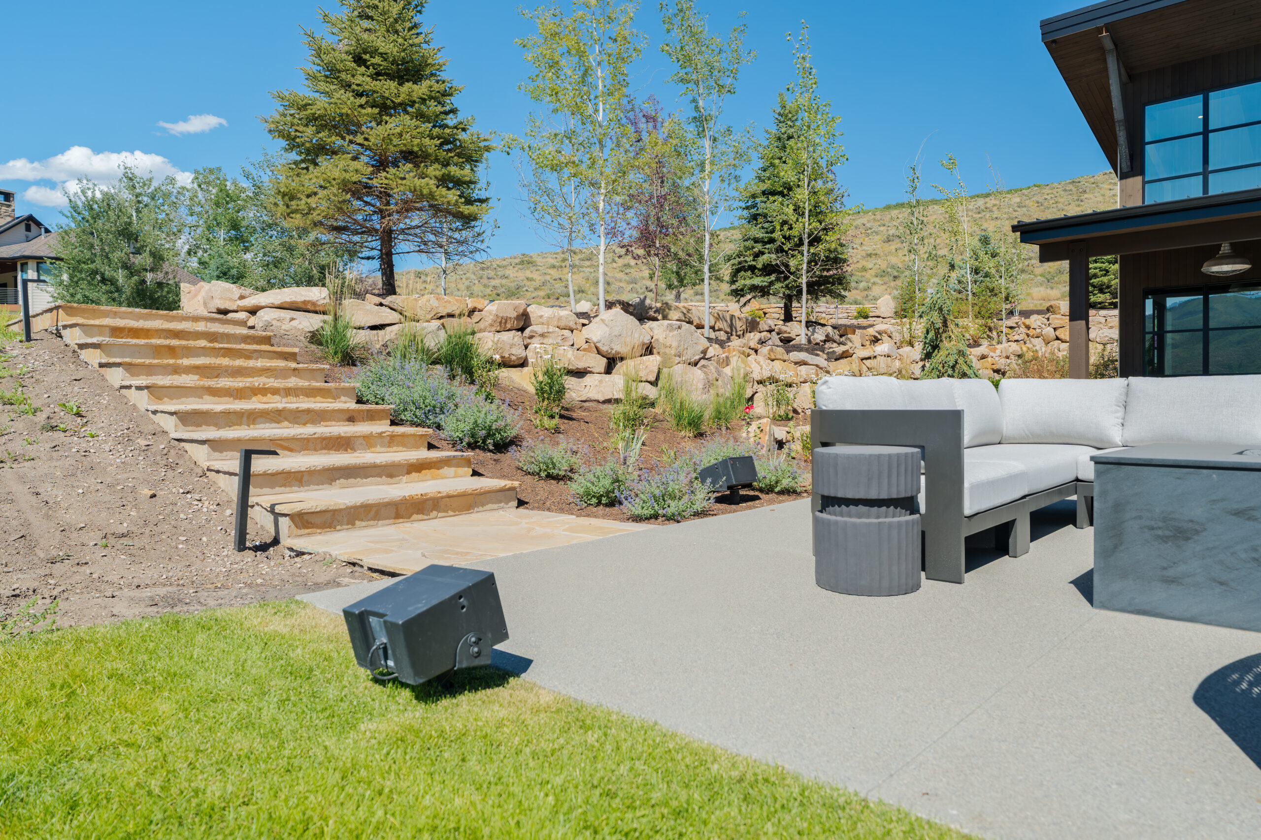 Outdoor entertainment areas leverage Ambisonic line-array speakers paired with a 12-inch burial subwoofer for evenly distributed audio throughout.