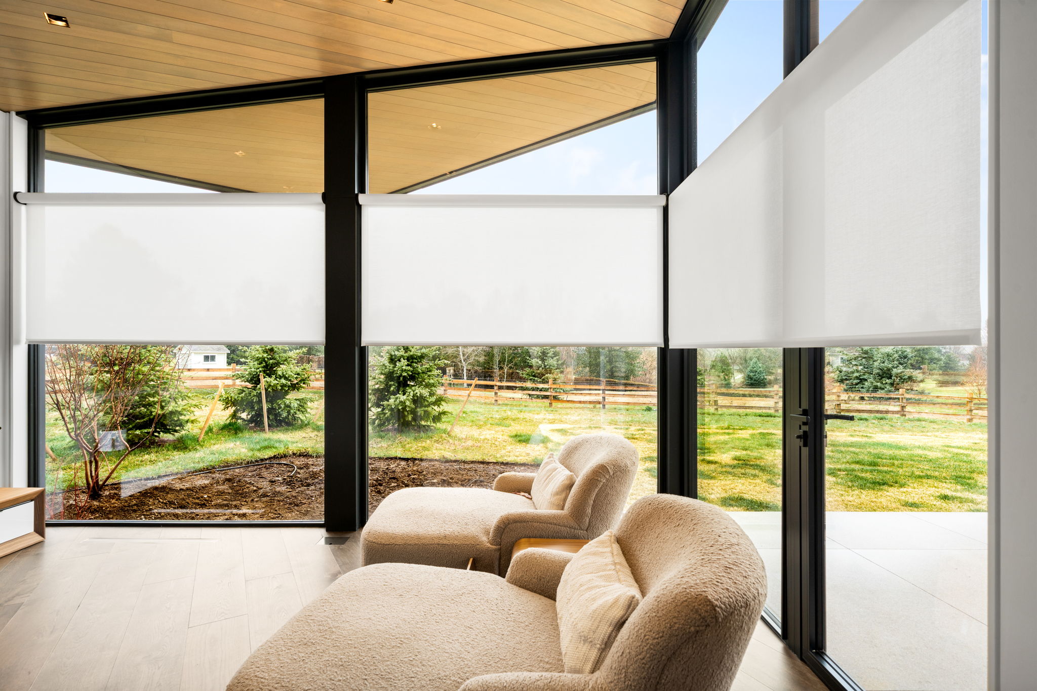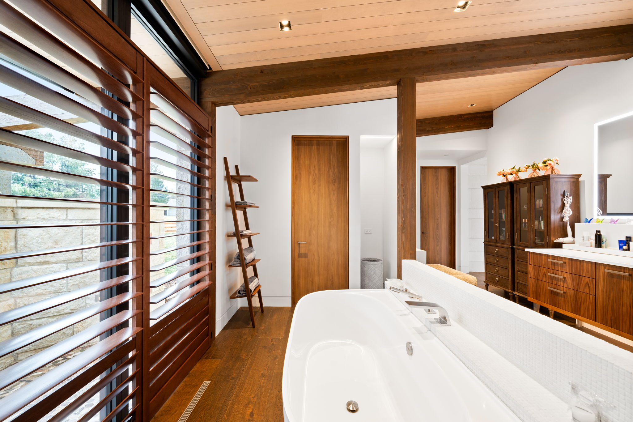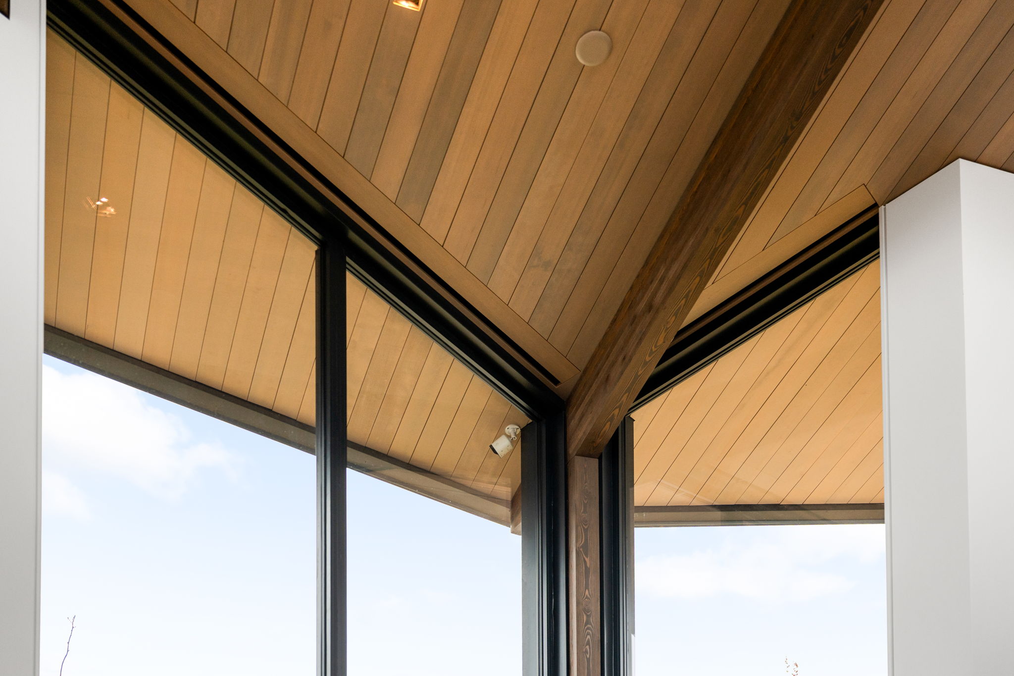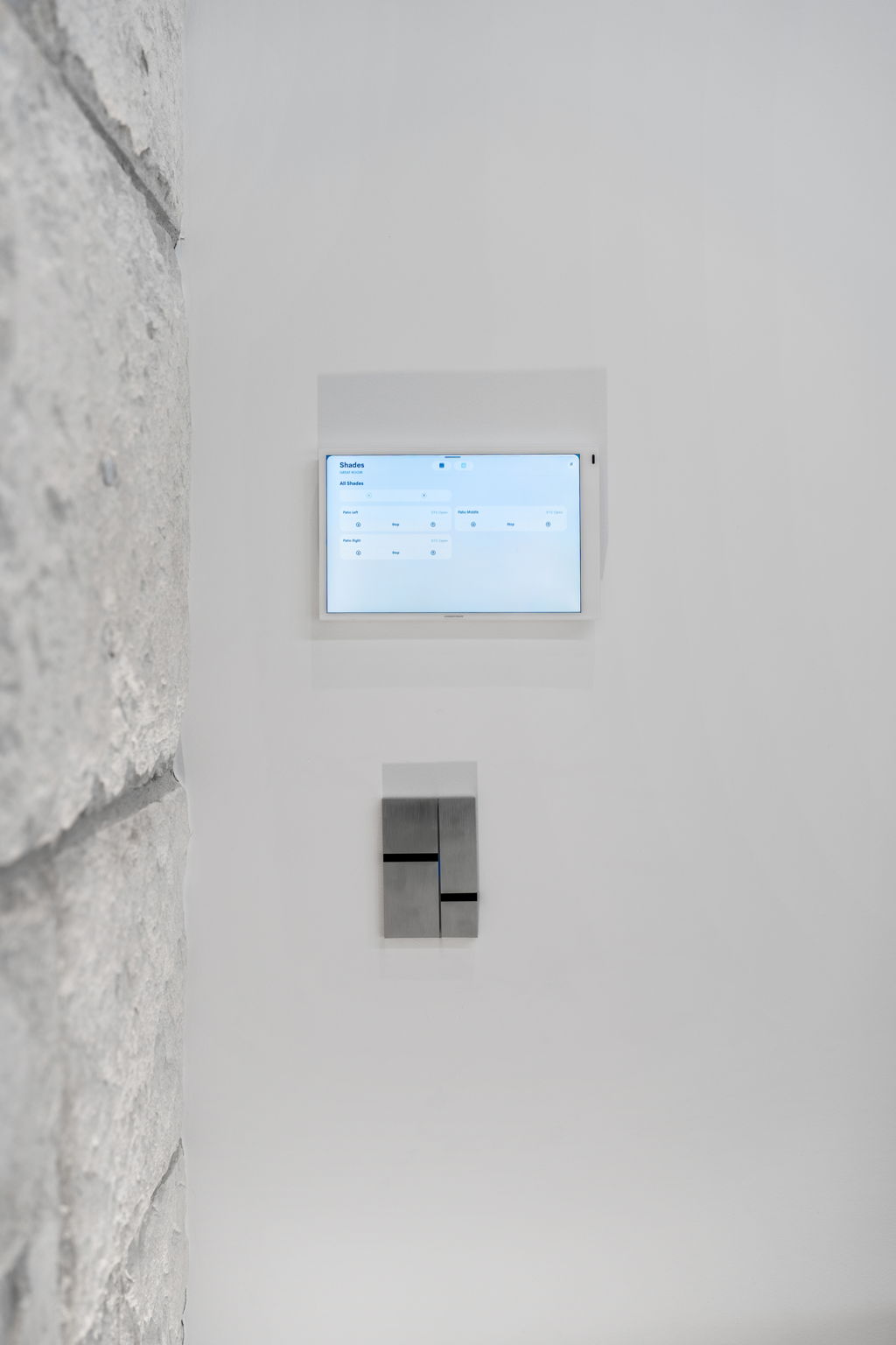 All technology had to be planned early. Motorized shades were fully concealed within custom tongue-and-groove ceiling details. Lighting was layered and architectural, designed to enhance natural materials rather than compete with them. Control interfaces were reduced to the essentials.