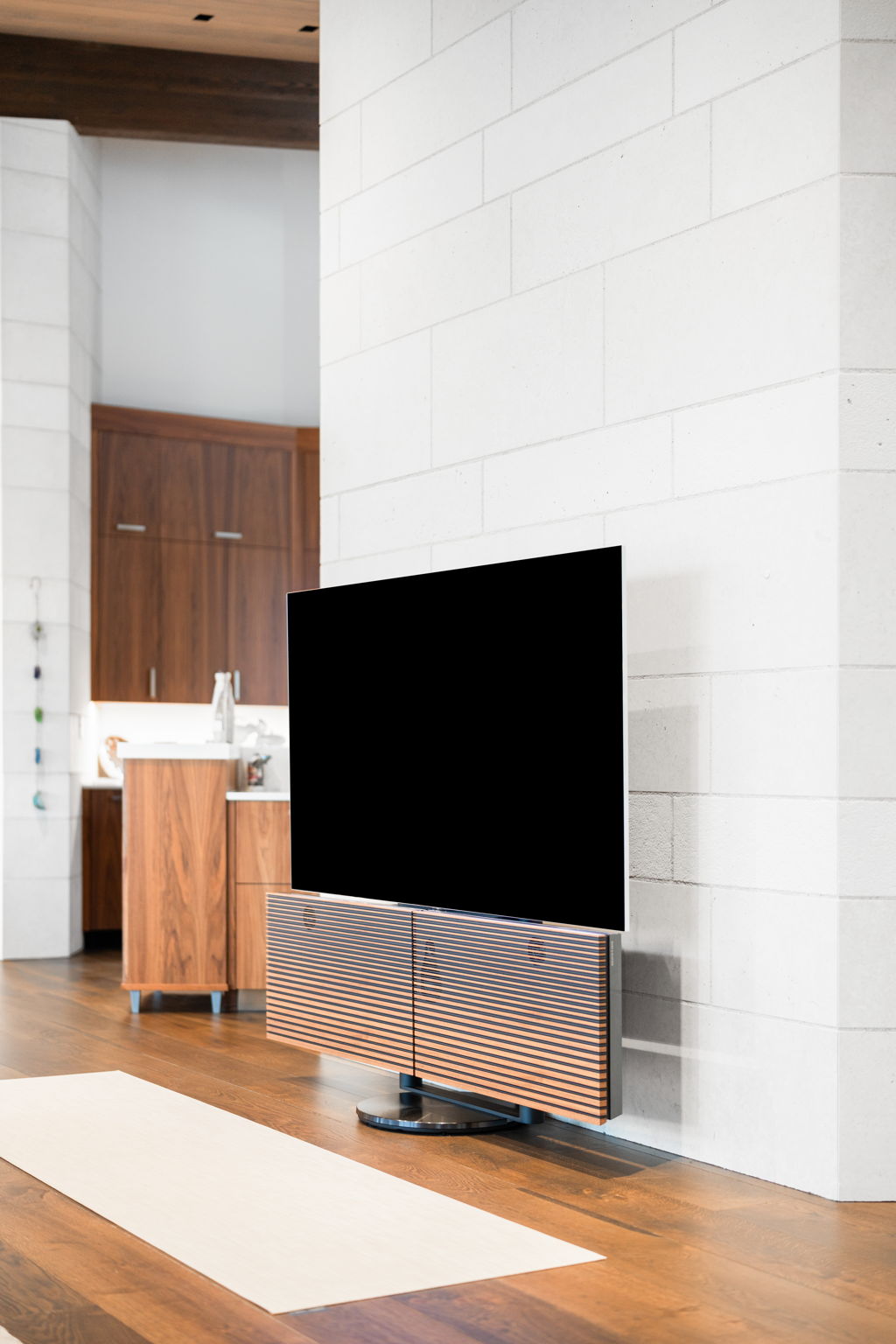 Audio and video systems were designed as sculptural elements rather than technical fixtures with Leon custom speaker enclosures and TV housings blending seamlessly into the surrounding millwork, while Bang & Olufsen Harmony displays serve as intentional focal points.