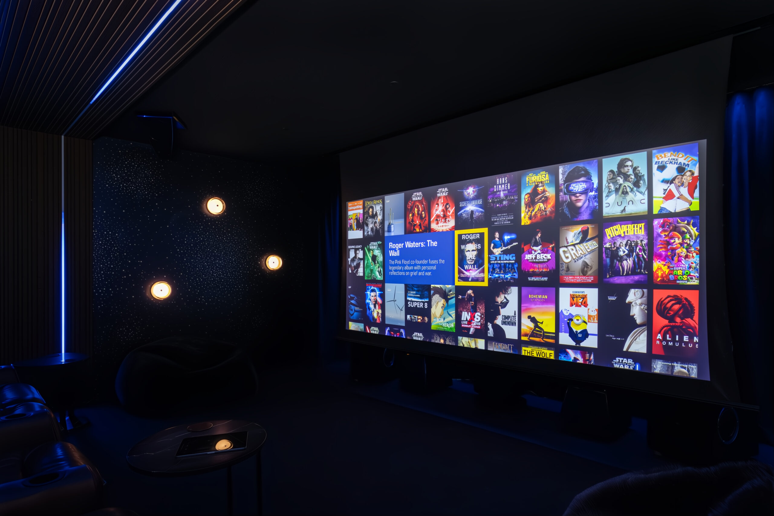 Sources include 4K Blu-ray, Kaleidescape, Zidoo media server, Apple TV, satellite TV, high-resolution music streaming and even CD and vinyl. Seating is provided by Cineak HARV chairs in high-grade leather, reinforcing the room’s luxury positioning.