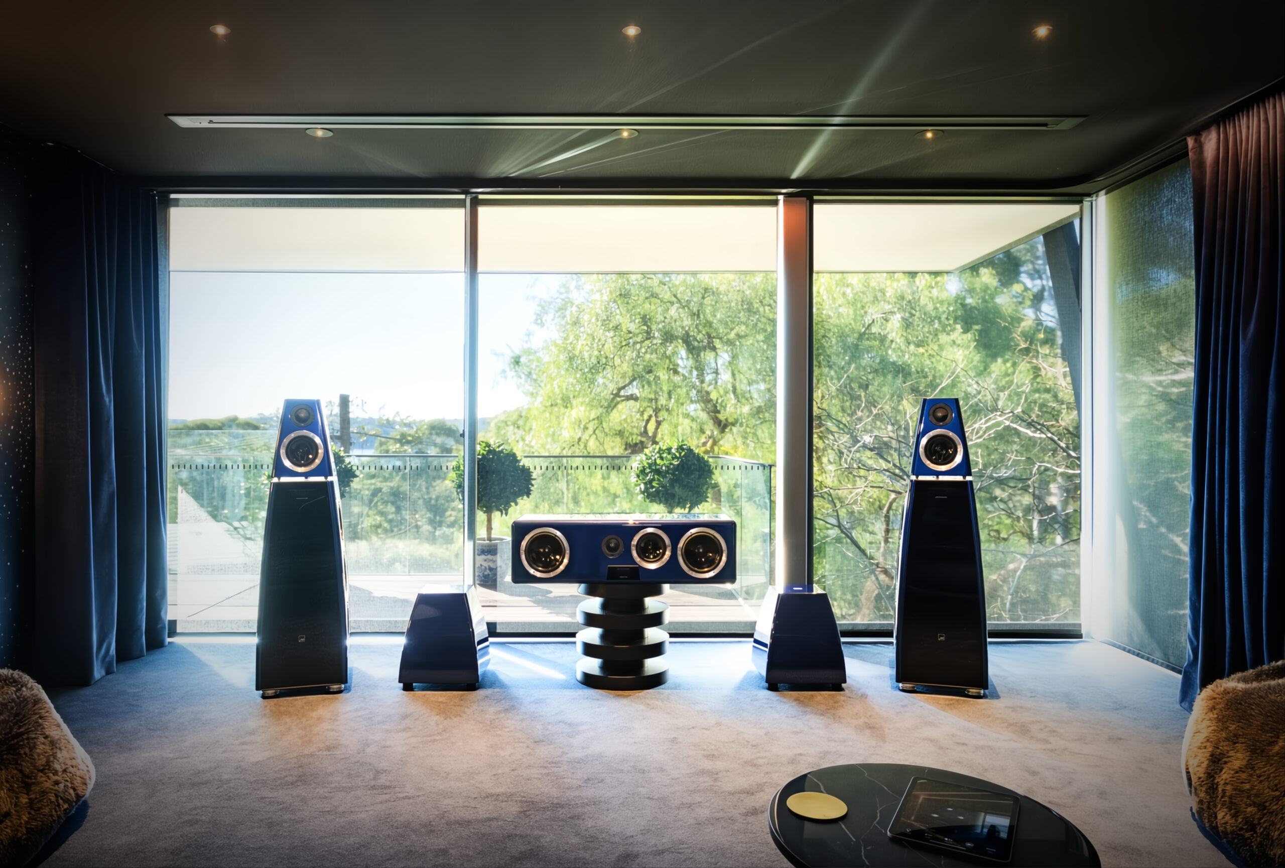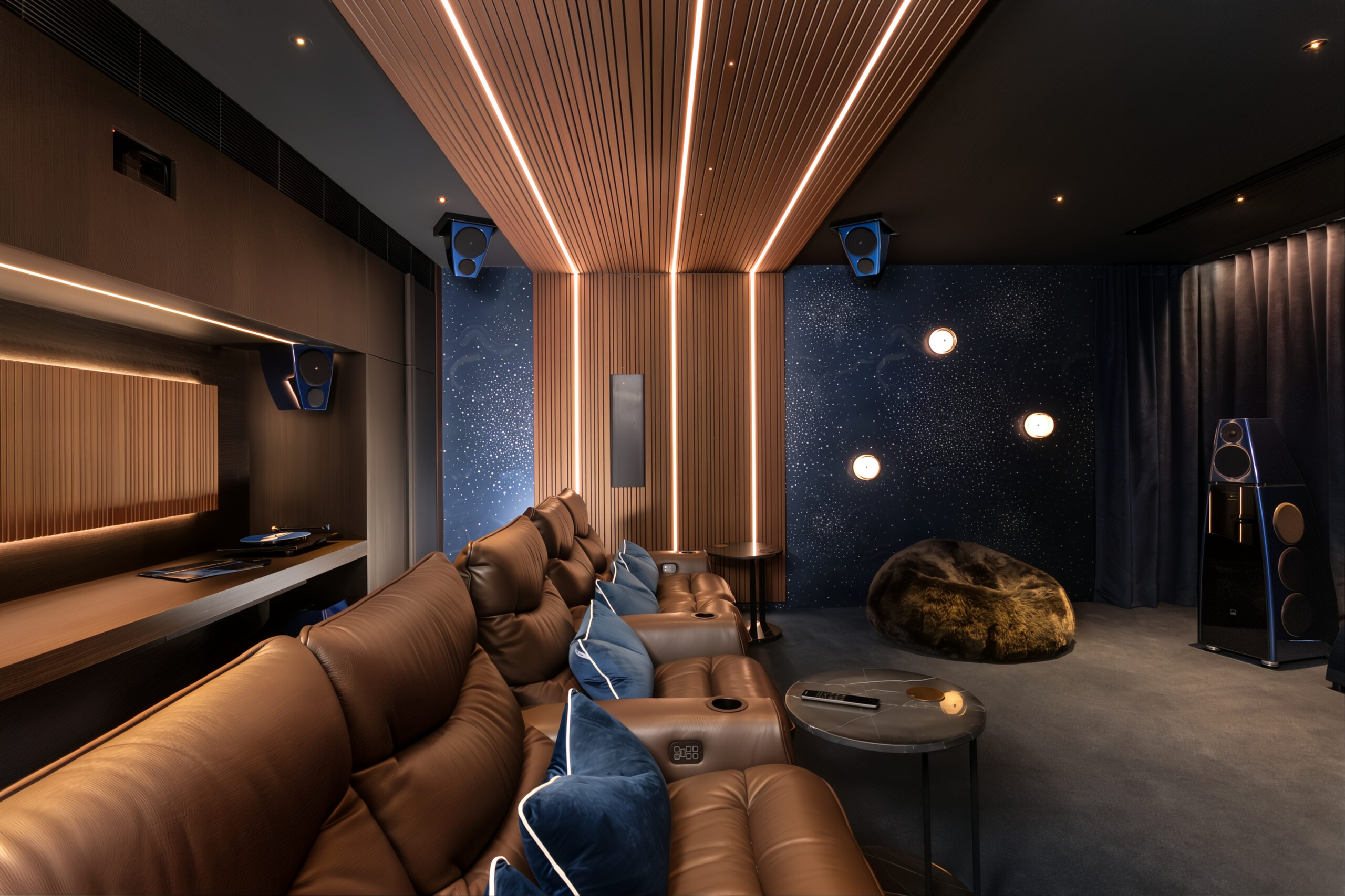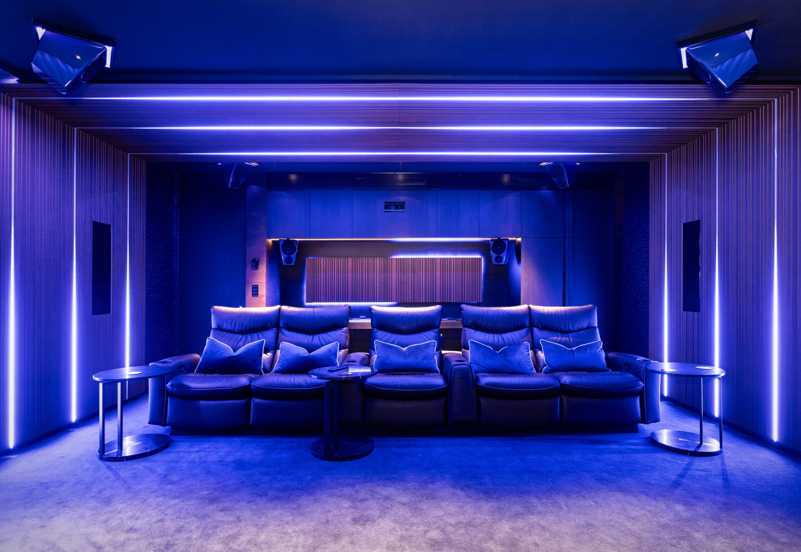 At the heart of this reference-grade cinema sits a Dolby Atmos 7.4.4 digital-active speaker system, finished in a custom deep blue metallic to complement the room’s design. A StormAudio processor manages a fully digital signal chain from source to speaker, ensuring signal integrity throughout.