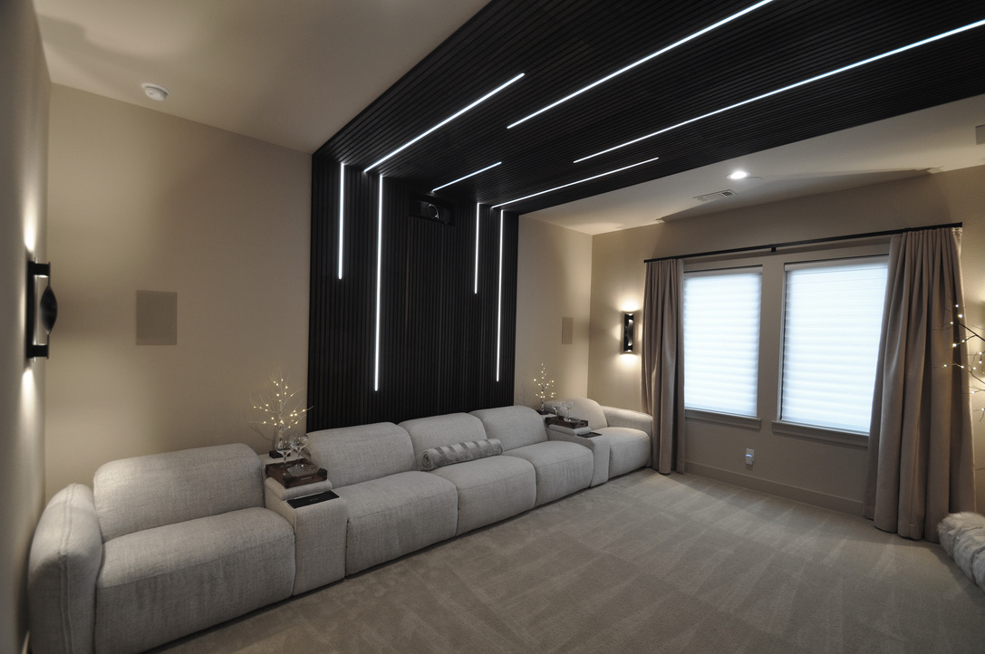 Despite operating on a tighter budget, the close collaboration between interior designer and integrator resulted in a remarkably tight and bespoke media room design. Custom wood ceiling and wall panels with LED lighting integrated directly into the millwork creates a statement upon walking in, and the custom scene-based lighting control helps keep the media room functional even in unconventional performance conditions.