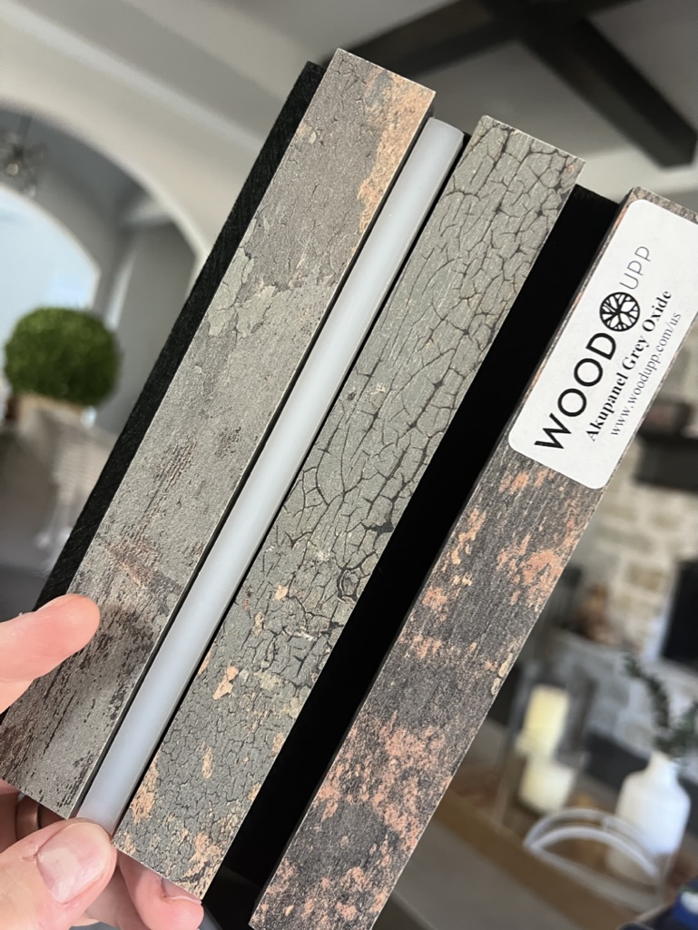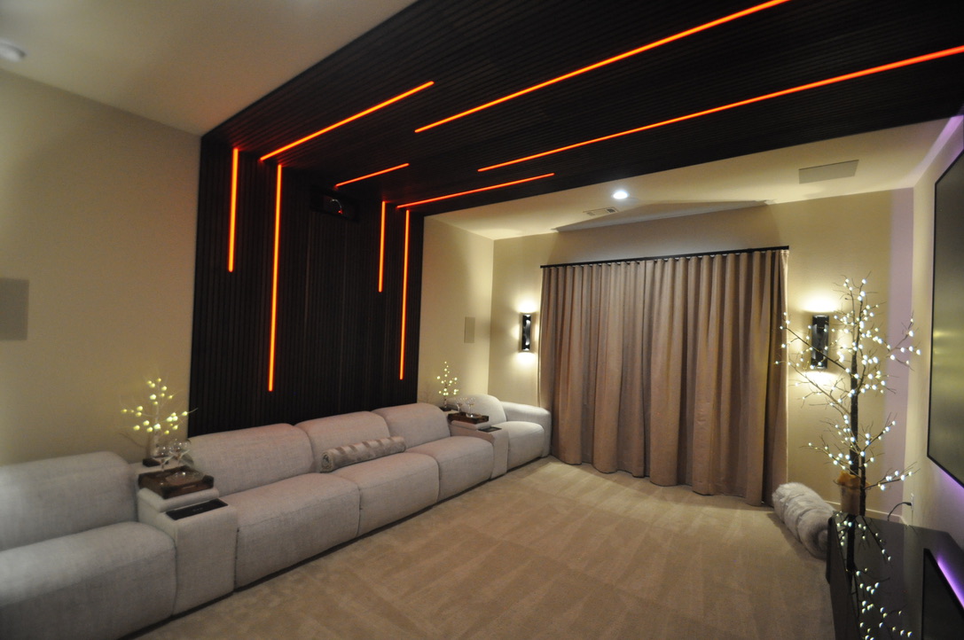 Products were delivered to the Theater Advice showroom for testing, mockups were built and days were spent brainstorming installation methods before a final approach was locked in. The result is a custom ceiling-integrated LED lighting system with color-changing capability and a bold, wood panel architectural pattern that defines the room.